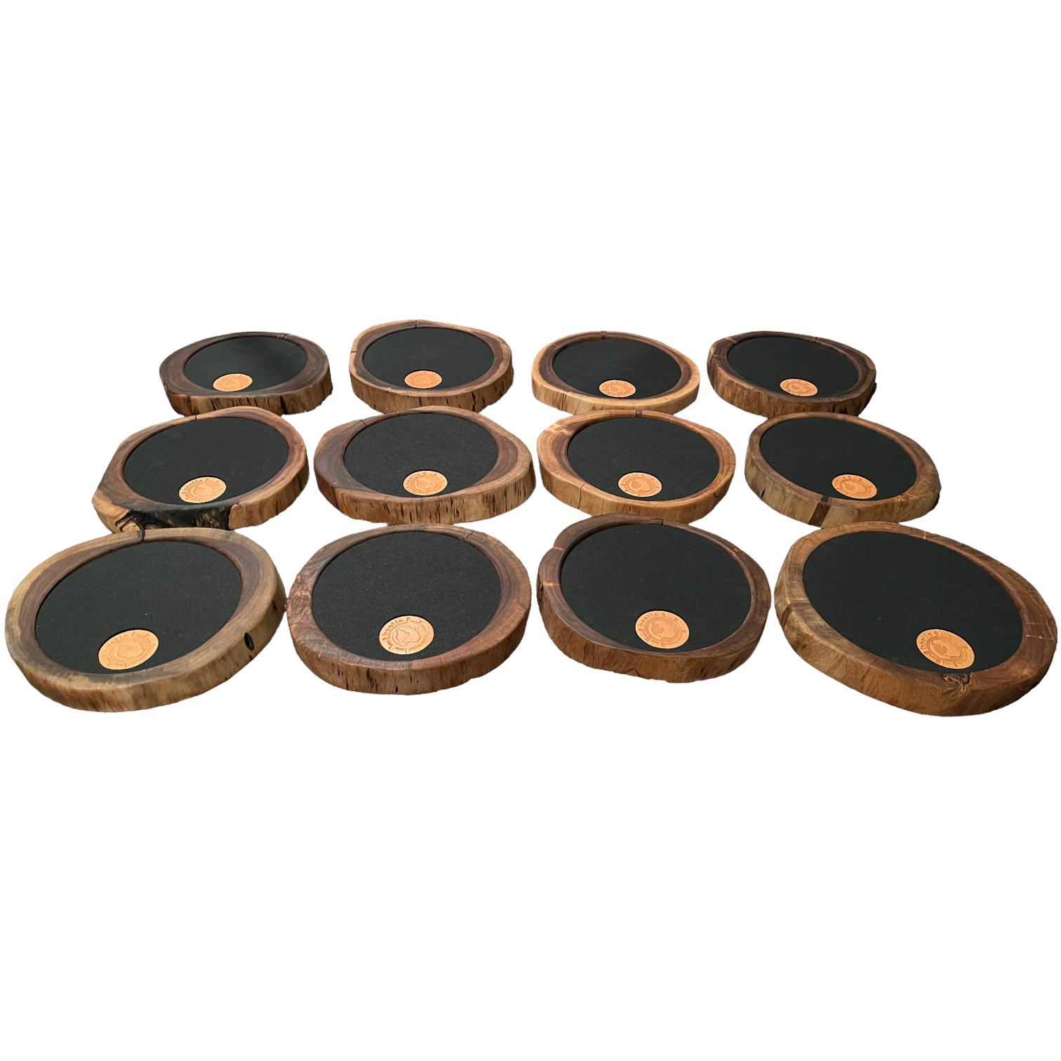 Pads are numbered from left to right, top to bottom, and listed in order in the options. This is another one-time, limited series of pads - they will never be made again - and I really don’t want to because Acacia is so hard. It is very high on the Janka hardness scale - meaning a super dense and heavy pad. The inertia disappears in to the end grain of these acacia discs - cut for wedding table decorations that did not happen. I love these pads so much, I made 17, kept 4 and gifted one - the remaining 12 are for the public. They were deeply inlayed to recess the 1/4” rubber into them and provide a hard rim that possibly only rosewood sticks would dent. Display it wood side up for a smart charcuterie board, then flip it over for some diddles to really impress your friends! These are gnarly chunks of tree that experience wood movement and might not sit flat - we have included three foam dots to support the pad if you need.