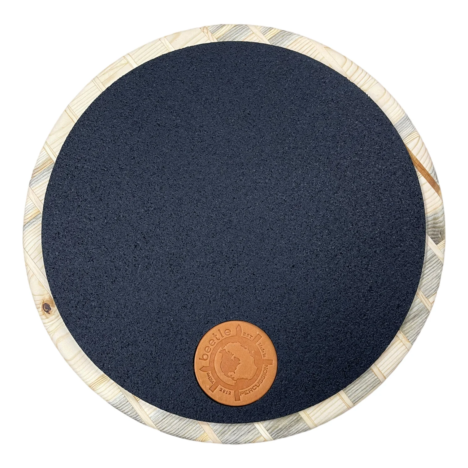 The Beetle Percussion Woodworker Series Practice Pad is 13" round beetle-killed pine and 1/4" tall recycled car tire rubber.